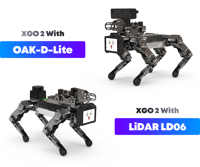 XGO-Mini 2 también se puede ampliar colocando sensor LiDAR LD06 en la parte posterior o una camara OAK-D-Lite en el brazo.