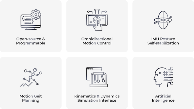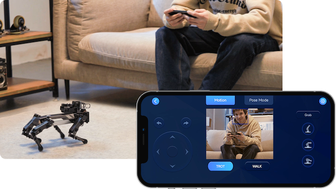 XGO 2 viene con tres estrategias y reglas de marcha diferentes, que son Trot, Walk y High Walk. Basado en el algoritmo de cinemática inversa, combinado con la optimización de la dinámica de la máquina, XGO 2 realiza un control de movimiento omnidireccional basado en la marcha Trot, doce grados de libertad de control de movimiento del cuerpo y admite el control superpuesto de actitud y control de movimiento.
